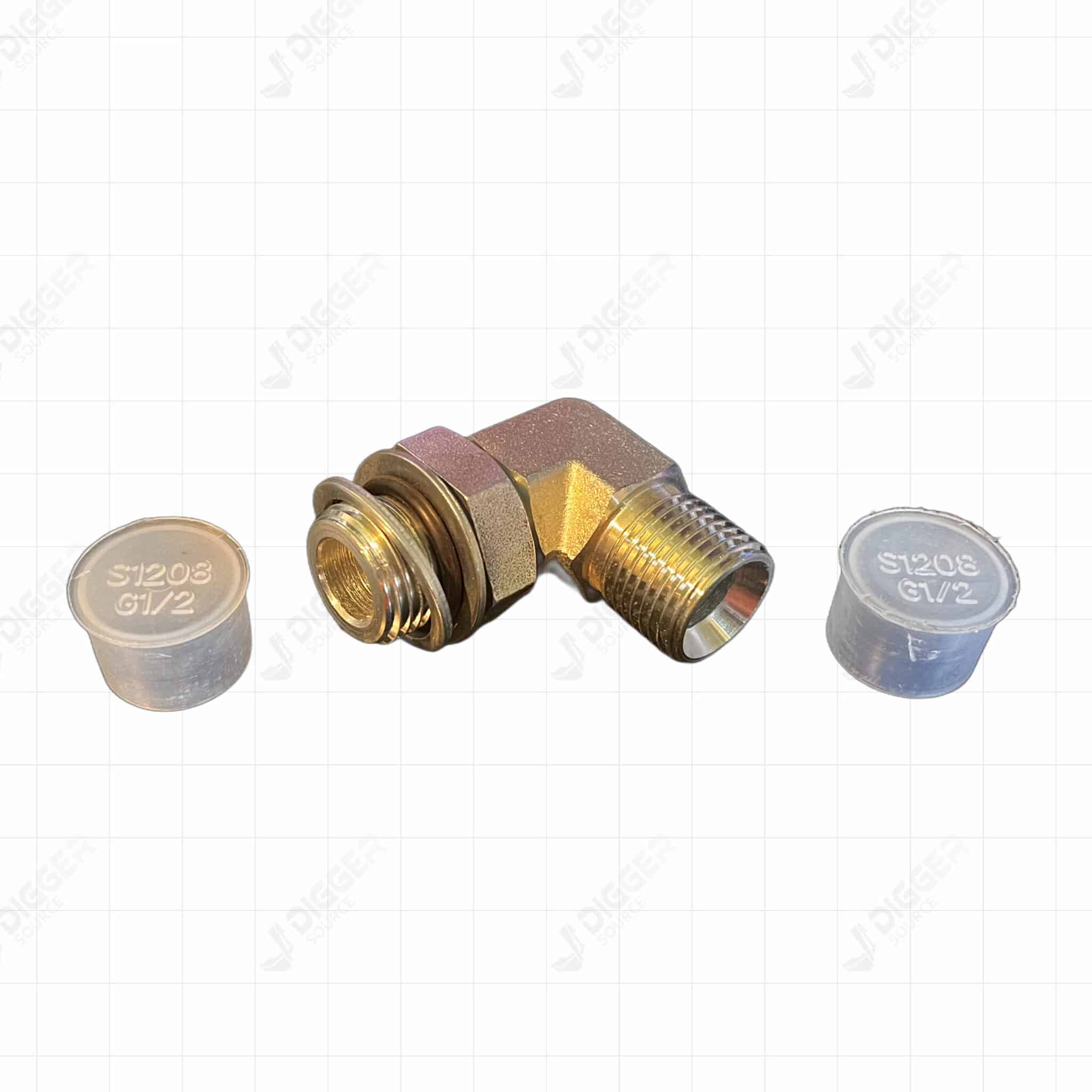 Durable elbow adapter fitting with G1/2 seal face connection on one end and G1/2 hose connection on the other. Ideal for secure, leak-free connections between hydraulic or pressure lines.