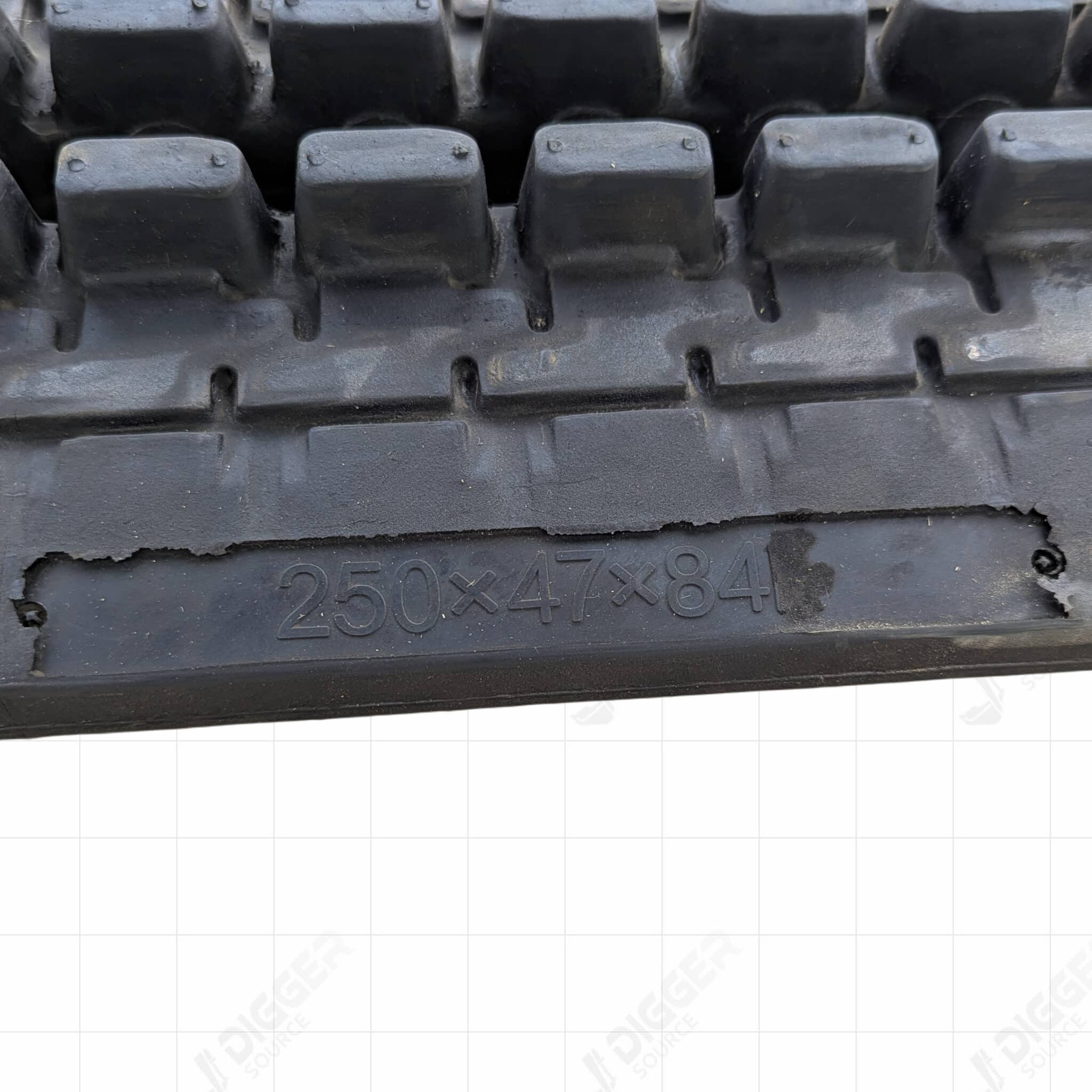 Excavator rubber track (250x47x84) with heavy-duty rubber and steel reinforcement. Durable, long-lasting traction for mini excavators on soil, gravel, and asphalt.